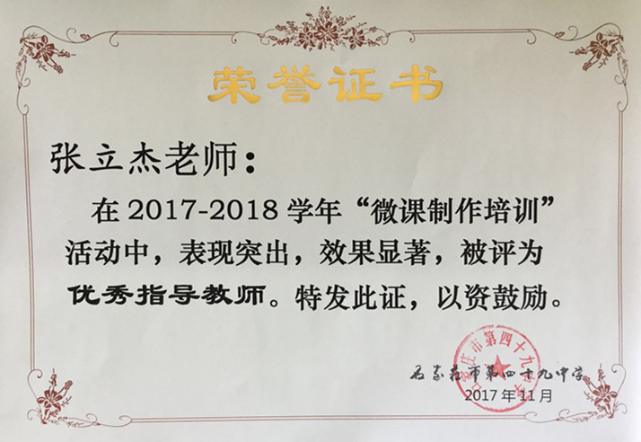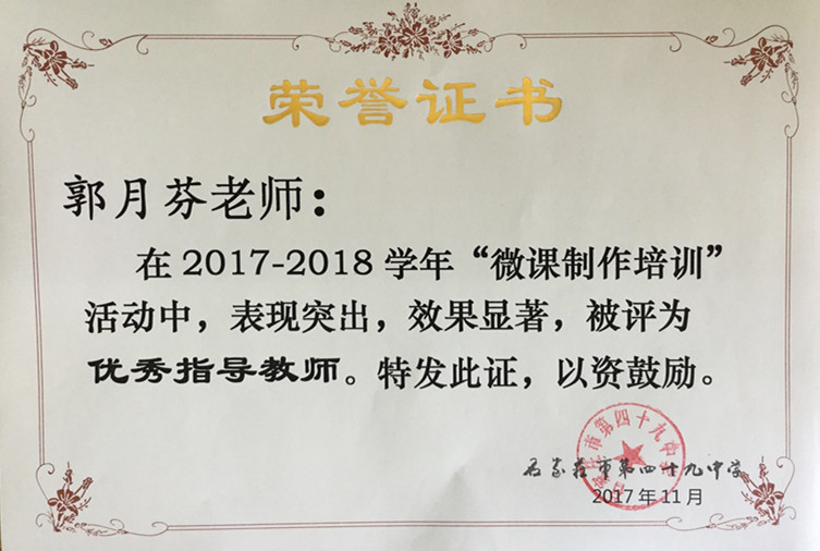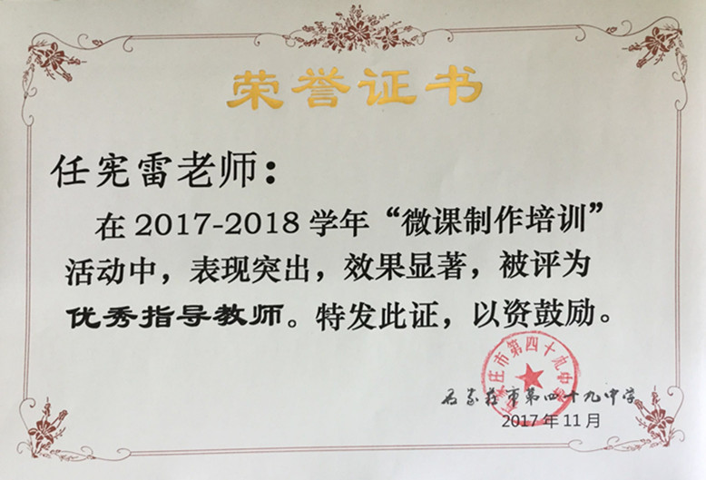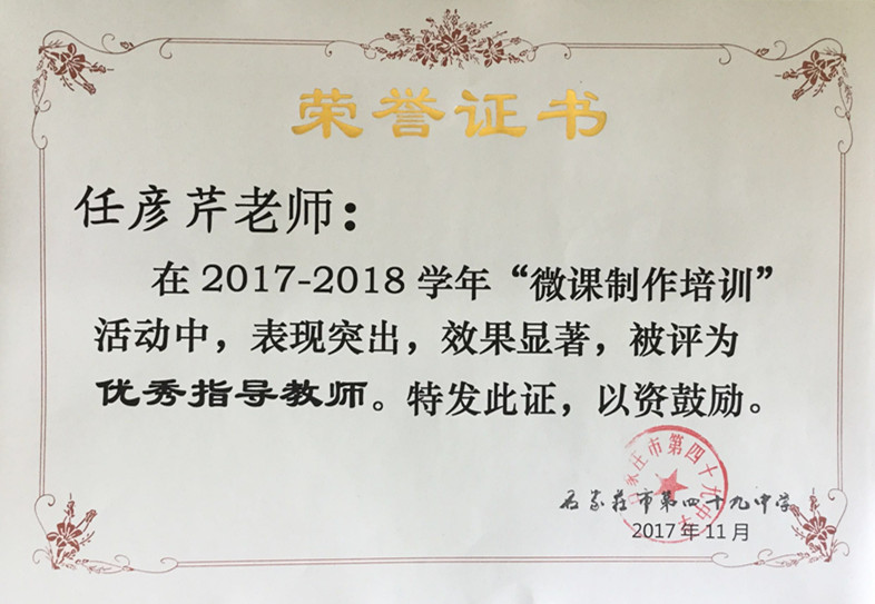 在这次微课制作培训活动中,任宪雷、张立杰、郭月芬、任彦芹被评为优秀指导教师。